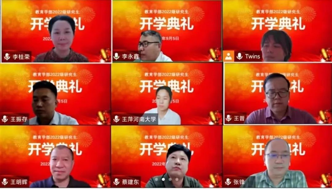 9月5日下午,教育學(xué)部2022級研究生開學(xué)典禮在線上順利舉行,教育學(xué)部領(lǐng)導(dǎo)班子成員、教師代表、導(dǎo)師代表、輔導(dǎo)員以及2022級全體研究生新生參加了開學(xué)典禮。開學(xué)典禮作為新生入學(xué)教育第一課,為接下來各項新生入學(xué)教育工作的展開打下了基礎(chǔ)。