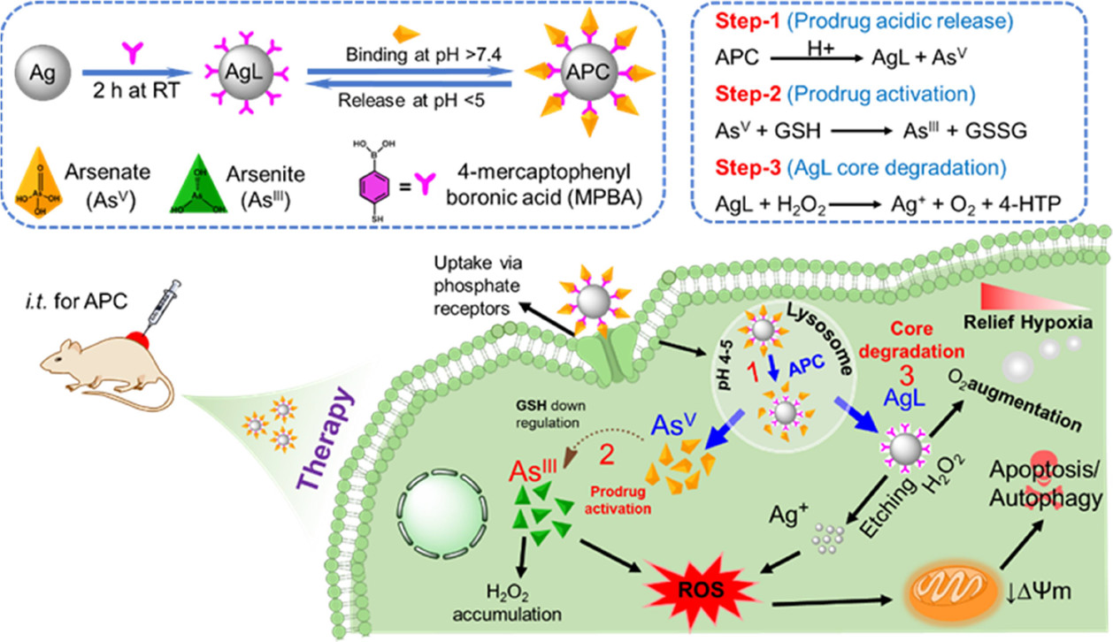 針對還原及乏氧的腫瘤微環(huán)境,實驗室設(shè)計了一種由銀納米粒子及表面螯合的砷V組成的砷基納米藥物。其具有GSH應(yīng)激釋放及內(nèi)涵體逃逸特性,能夠通過抑制腫瘤細(xì)胞內(nèi)的GPx及SOD,實現(xiàn)LC3自噬介導(dǎo)的細(xì)胞凋亡,進(jìn)而有效抑制腫瘤細(xì)胞增殖。實驗結(jié)果表明,砷基納米藥物在腫瘤治療及原位檢測方面有著巨大的應(yīng)用前景。該成果發(fā)表在ACS Applied Materials & Interfaces 2022, 14, 32, 36487–36502(IF=10.383,SCI一區(qū)期刊)。博士研究生閆紀(jì)亮、博士后研究員Sumaira Hanif為該論文共同第一作者,吳海剛博士、Pir Muhammad博士為共同通訊作者。