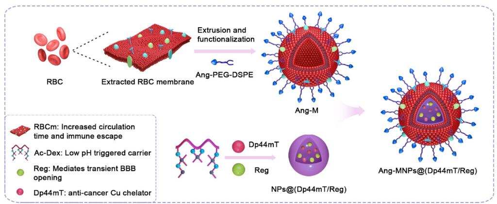 利用螯合劑2-(二-2-吡啶基亞甲基)-N,N-二甲基肼基硫代甲酰胺(Dp44mT)可選擇性靶向癌細(xì)胞中高濃度的銅離子并產(chǎn)生大量活性氧(ROS)來殺傷腫瘤細(xì)胞這一特點,實驗室將Dp44mT與血管擴(kuò)張劑瑞加德松(Reg)共同裝載到納米粒子中,外部修飾靶向多肽Angiopep-2功能化的紅細(xì)胞膜(Ang-M)。實驗證明,該主動仿生納米藥物Ang-MNPs@(Dp44mT/Reg)可以有效穿越血腦屏障(BBB),主動靶向GBM病灶,且血液循環(huán)時間長,毒副作用低。U87MG-luc原位GBM模型小鼠實驗表明,其能夠有效抑制腫瘤生長并延長荷瘤小鼠的生存周期。該納米遞送系統(tǒng)還可拓展為一體化平臺應(yīng)用于腦部疾病的診療。該成果發(fā)表在Biomaterials 2022, 289, 121760(IF=15.305,SCI一區(qū)期刊)。博士后研究員Muhammad Ismail、研究生楊汶、李彥飛為該論文共同第一作者,冰洋教授、David B. Lovejoy教授為共同通訊作者。