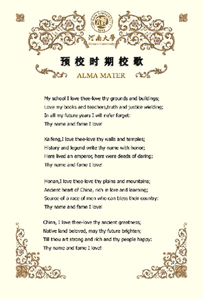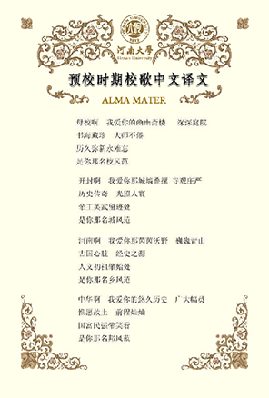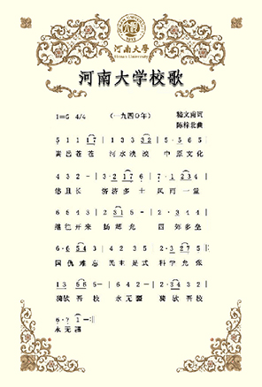 2002年9月,在建校90周年之際,河南大學(xué)決定恢復(fù)使用1940年的《河南大學(xué)校歌》,并根據(jù)時(shí)代發(fā)展,將原歌詞中的":三民"與"四維"改作"民主"與"科學(xué)"?!逗幽洗髮W(xué)校歌》重新在師生中廣為傳唱,成為新時(shí)期河大人繼往開(kāi)來(lái),再創(chuàng)輝煌的戰(zhàn)斗號(hào)角。